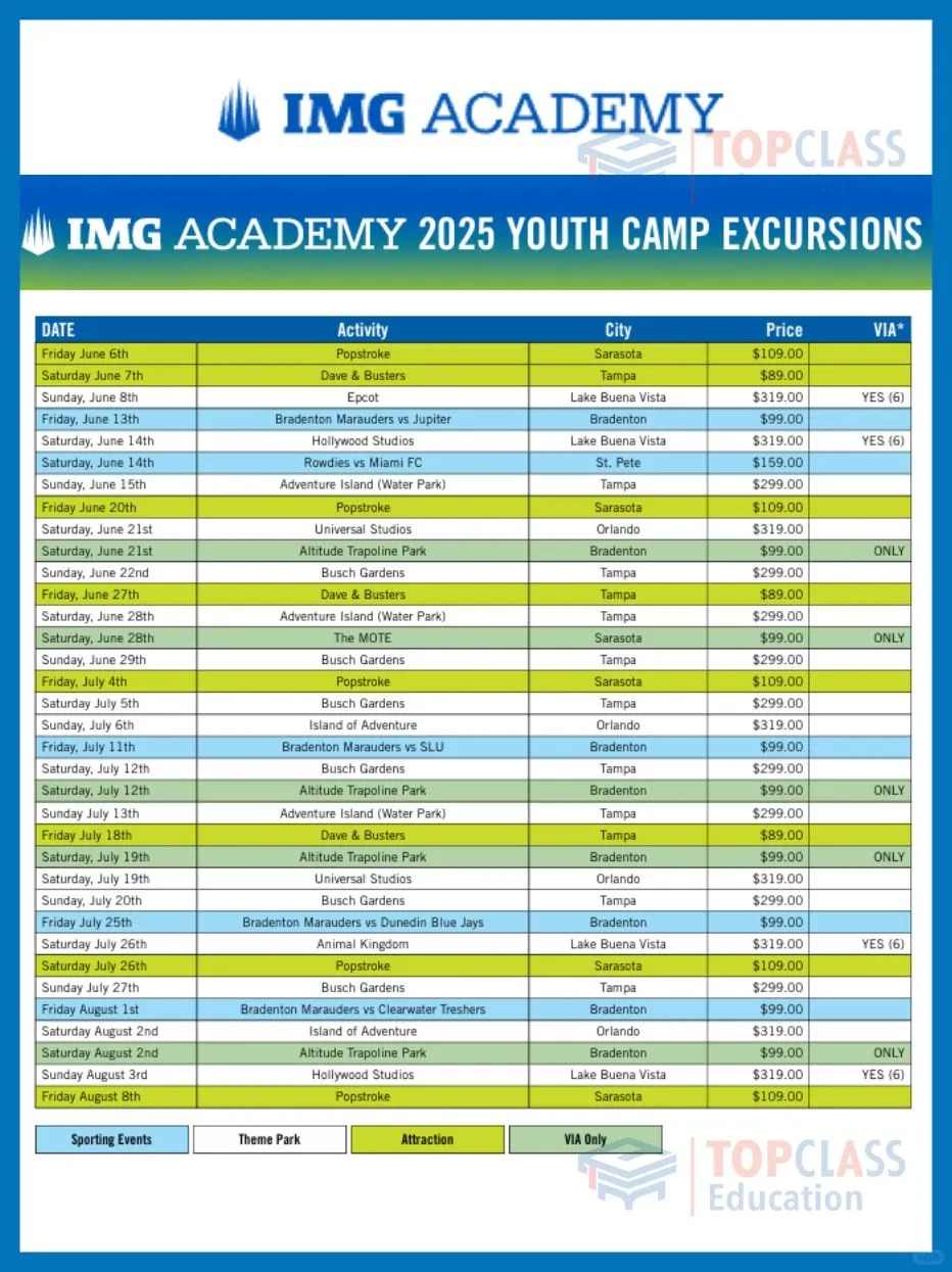 IMG全年都有营地,供你随时可以找到一个合适的计划。它的训练营可根据孩子的年龄、技术水平和运动目标提供定制的课程选择(详细的项目和日程安排见下图)。